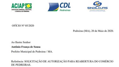O pedido para a reabertura do comércio em Pedreiras foi oficializado ontem (20), pelas entidades empresariais: ACIAP (Associação Comercial Industrial e Agrícola de Pedreiras), CDL (Câmara de Dirigentes Lojistas de Pedreiras) e SINDILOJAS (Sindicato do Comércio Varejista de Bens e Serviços de Pedreiras e Região). Segundo o ofício, as entidades estão atendendo diversas reivindicações de seus associados, que participaram de uma reunião por vídeo conferência, totalizando mais de 50 (cinquenta) lojistas e prestadores de serviços.