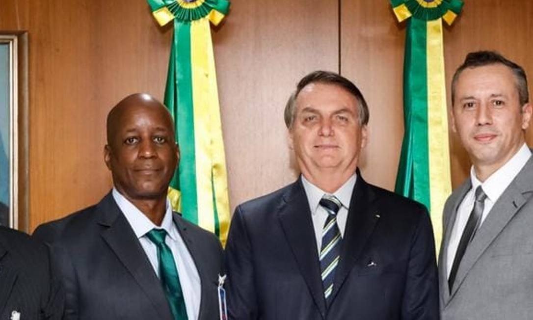 O presidente Jair Bolsonaro entre Sérgio Camargo, no momento afastado na Fundação Palmares, e o secretário de Cultura, Roberto Alvim Foto: Reprodução