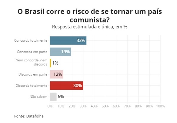 Dos entrevistados que concordam com a afirmação sobre o risco de o Brasil adotar um regime comunista, 33% concordam totalmente, e 19%, parcialmente. A crença sobe a 73% entre aqueles que votaram em Jair Bolsonaro (PL) no segundo turno de 2022. Eleitores de Lula são os que mais descartam a hipótese (61%). Apenas 32% deles a consideram plausível.