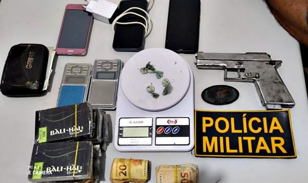 Policiais Militares de Trizidela do Vale, (3º PPM), durante a realização de rondas no Balneário da CAEMA, em Pedreiras, prendeu um homem suspeito de tráfico de droga. No local, um bar, foram encontrados: Uma pistola de fabricação caseira, calibre 380 com um carregador contendo 02 (duas) munições; 04 trouxas de substância semelhante à cocaína; 03 balanças de precisão; 01 celular samsung preto; 01 celular Samsung rosa; 01 celular xaiomi preto; 01 carregador de celular; 08 pacotes de Bali Hais (narguilé); 01 chaveiro com 03 chaves; uma chave de moto; R$ 1.399,00 (mil e trezentos e noventa e nove reais); R$ 167,00 (cento e sessenta e sete reais); uma carteira contendo, RG do conduzido, 01 cartão nu bank, crlv de moto, cartão do SUS, título d eleitor, 01 cartão PagBank e 01 cartão da Caixa Econômica.