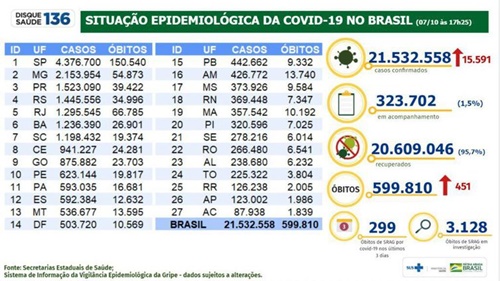 O Brasil registrou mais 15.591 casos de covid-19 e 451 mortes pela doença em 24 horas, segundo a atualização epidemiológica divulgada pelo Ministério da Saúde nesta quinta-feira (7). Ao todo, o país teve 21.532.558 casos de covid-19, com 599.810 mortes, desde o início da pandemia.