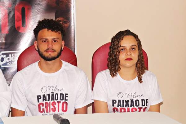 Geysa Corrêa (Maria Madalena) e Regivan Lopes (Jesus), representaram todo o elenco durante a coletiva de imprensa, que reuniu tv, rádio, influencers digitais, blogueiros, jornalistas e outros meios de comunicação de Pedreiras e de Trizidela do Vale.