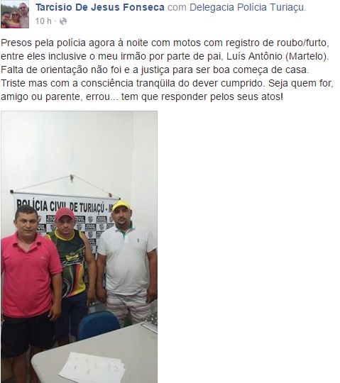 “Triste, mas com a consciência tranquila do dever cumprido. Seja quem for, amigo ou parente, errou… tem que responder pelos seus atos!”, escreveu o delegado em sua página pessoal no facebook.