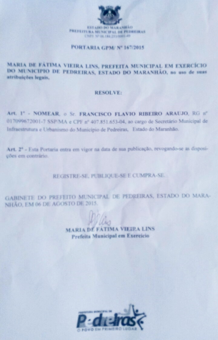 “Maria de Fátima Vieira Lins, Prefeita Municipal em exercício do Município de Pedreiras, Estado do Maranhão nomeia: Damião Felipe Barbosa/Secretario de Administração,Francisco Flavio Ribeiro Araujo/Secretario de Infraestrutura Urbanismo, Francisco Rodolfo Furtado Vieira/Secretario de Finanças e Francinete Braga /Assessora de Comunicação e Imprensa”.