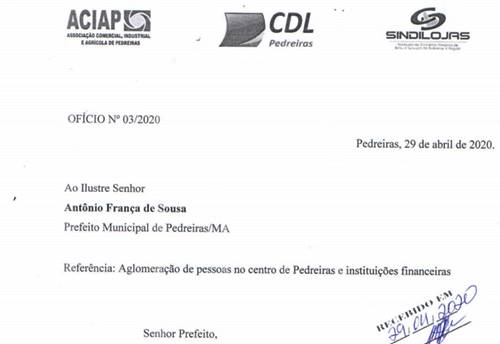 Devido as grande aglomerações, ocorridas nos últimos dias, no centro comercial de Pedreiras, as entidades representativas ACIAP, CDL e SINDLOJAS, encaminharam ofícios ao Comando do 19º Batalhão de Polícia Militar e ao Prefeito de Pedreiras, Antônio França de Sousa, no sentido que sejam tomadas as medidas cabíveis, para tentar conter o grande número de pessoas que tem se aglomerado em frente às agencias bancárias, casas lotéricas e outros correspondentes bancários.