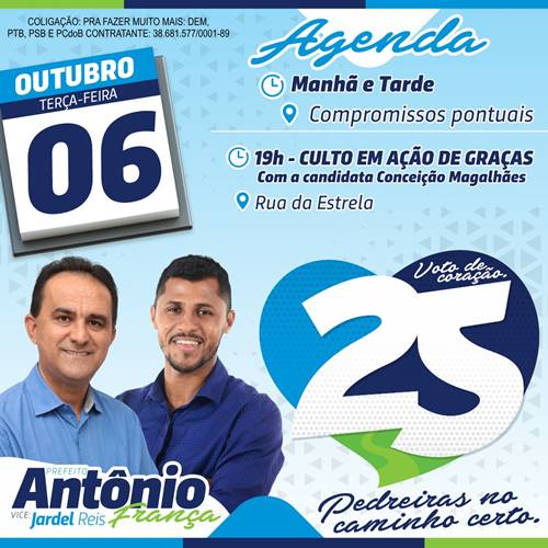 Pedreiras: Agenda dos Candidatos a Prefeito 06/10 Sandro Vagner 5 anos atrás Apenas duas coordenações nos enviaram a agenda do candidato para hoje (06/10). Antonio França – DEM Vanessa Maia – SOLIDARIEDADE Compartilhe isso:Print
