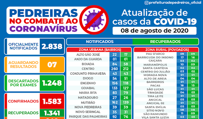 A Secretaria Municipal de Saúde de Pedreiras através do Grupo Técnico (GT) do COVID- 19 informa os dados epidemiológicos do COVID-19 da 32 Semana Epidemiológica (período de 02/08/2020 a 08/08/2020) em Pedreiras, registramos 1.583 casos confirmados para COVID-19, destes 1.341 são recuperados; a taxa de incidência é de 403,5 casos confirmados para cada 10 mil habitantes e uma taxa de mortalidade de 11,5 óbitos para cada 10 mil habitantes.