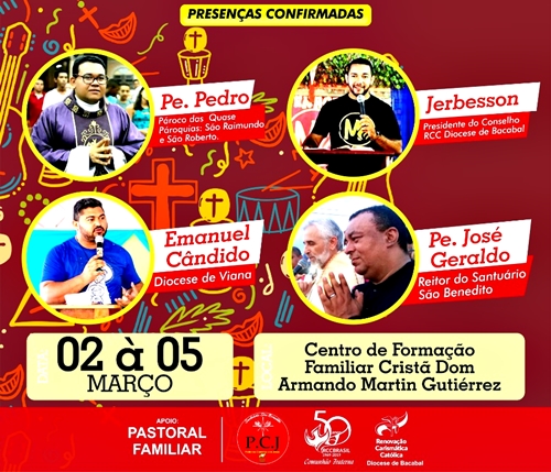 Durante o carnaval, nos dias 02, 03, 04 e 05 de março, sempre a partir das 14 horas, no Centro de Formação Familiar Cristã Dom Armando Martin Gutierrez, com a participação de padre Pedro, das pró-paróquias de São Roberto e São Raimundo do Doca Bezerra; Jerbesson, presidente do conselho da Renovação carismática Católica da Diocese de Bacabal; Emanuel Cândido, da Diocese de Viana; e padre José Geraldo, reitor do Santuário de São Benedito.