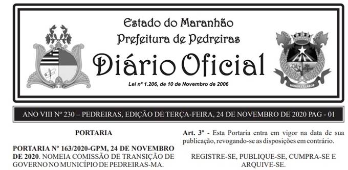 A Portaria Nº 163/2020-GPM, 24 de novembro 2020, que nomeia a  Comissão de Transição de Governo no Município de Pedreiras, foi divulgada no Diário Oficial da Prefeitura.