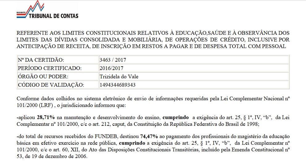 No link abaixo, a certidão do TCE, referente à transparência regular do Município de Trizidela do Vale.